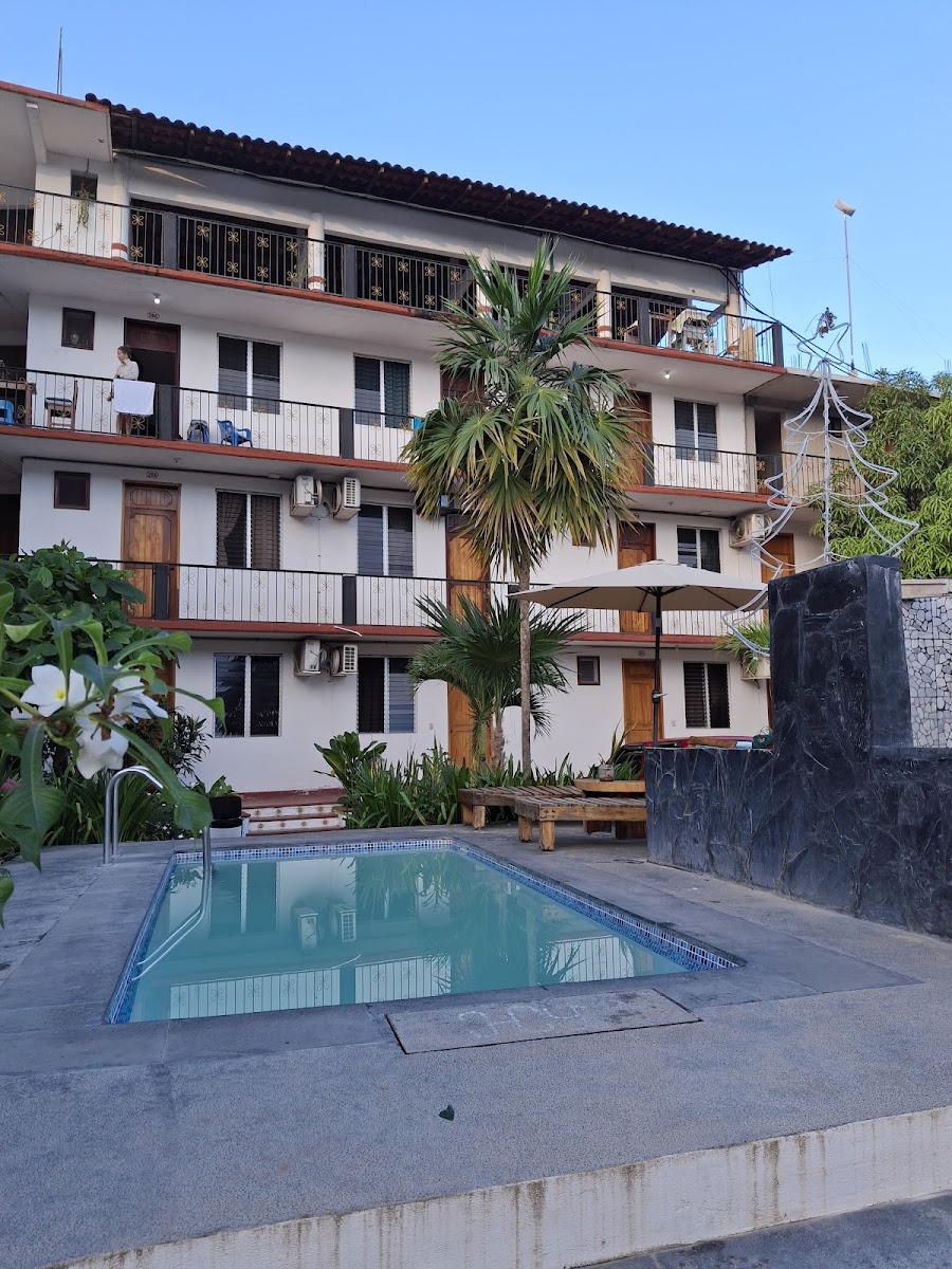 This is my go to when I’m Puerto Escondido. It doesn’t look attractive from the street but the inside is very nice. There’s seating area, nice clean little pool and a rooftop resting area. The kitchen of the first floor is available to all guests but not well equipped and VERY dirty. A few time in my stayed I thought like:"ok, come on! Let’s check what I can do with it…” but just stepping in, all my plan to go grocery shopping felt apart The noise from the street can be annoying and it worse when you are at the last floor because your basically line up with the road. At the first floor, there’s less noise but no opening on the back of the room so no air flow possible. There’s a few "permanent" people that come every year and they rent years around the kitchens of the second and third floor to exclusives use when they are there and storage when they’re gone. I have mixes feeling about it. It was obviously set up to offer a communal kitchen on every floor and the setup of those long times renters give a little feel to be in their personal backyard. Beside that, the place is nice, constantly improving, cheap and the best location in Puerto. Access to the beach is down the road almost next to the hotel. You right between the famous surfing beach with mostly international tourists and the little down town fishing’s "village" where there’s plenty of typical Mexican restaurants and tourists boutiques with more local tourism.